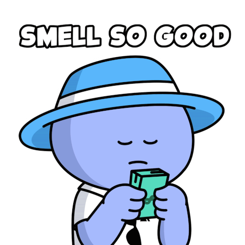 A cartoon character happily sniffs a stack of money, with the caption 'SMELL SO GOOD' above, expressing delight.