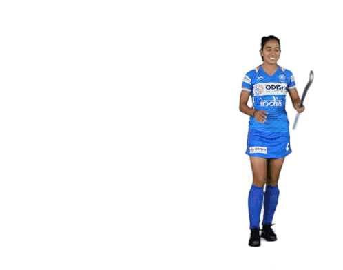 Monika, the Indian Eve hockey player, celebrates with her stick, surrounded by glowing blue particles. A joyful and energetic sticker.