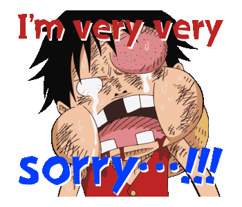 Monkey D Luffy, beaten and crying, expresses deep regret with the words 'I'm very very sorry...!!!' in this emotional sticker.