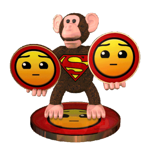 A 3D animated monkey in a Superman costume holds two sad Geometry Dash emoji faces.