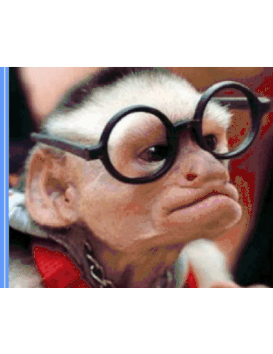 A small monkey wearing large, round black-rimmed glasses makes a funny, serious face, looking directly at the viewer.