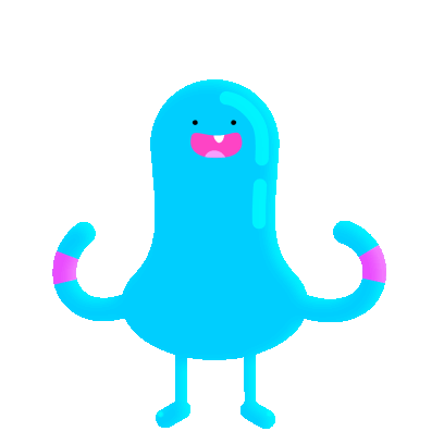 A cute, light blue, blob-like monster with a happy smile and small limbs, featuring a green and pink loop on its head, bouncing playfully.