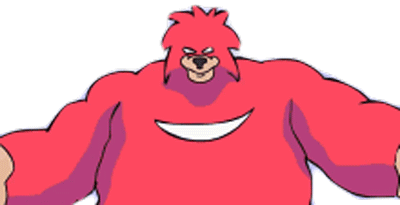 A vibrant red, muscular cartoon monster with sharp teeth and a wide smile on its chest blinks and moves slightly.