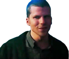 J Daniel Atlas, played by Jesse Eisenberg, shifts from a fake smile to a serious, saddened expression, looking down.