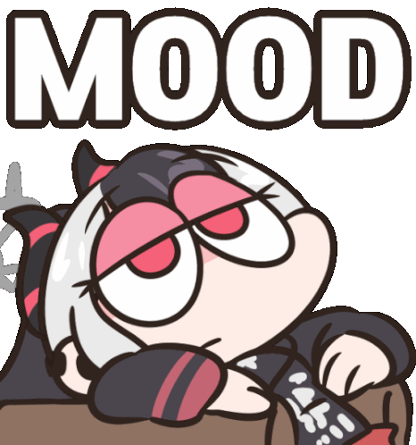 A tired-looking cartoon character with red eyes and white hair lies down, expressing a 'mood' or 'whatever' feeling.