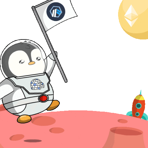 A cute penguin astronaut plants a flag with the Arbitrum crypto logo on a red planet, with Ethereum and a rocket in space.