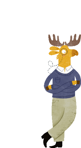 A smart moose character, wearing glasses and a sweater, stands with arms crossed, deep in thought with a subtle thought bubble animation.