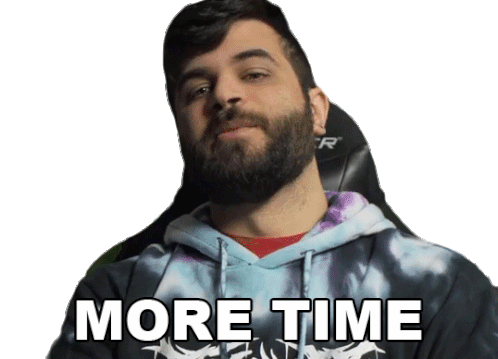 Andrew Baena, a bearded man in a hoodie, gestures while saying "More Time" from his gaming chair.