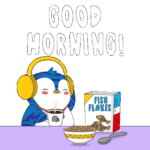 Pudgy the penguin enjoys a cozy morning breakfast, sipping from an igloo mug and eating fish flakes while wearing headphones.