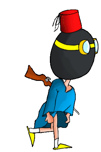 Moroccnninja, a cartoon character wearing a fez and goggles, in a dynamic pose, representing a Moroccan ninja.