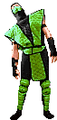 Pixel art of Reptile from Mortal Kombat, depicted in his iconic green ninja costume, standing ready for battle.