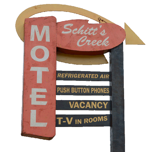 An animated vintage-style sign for the iconic Schitt's Creek Motel, featuring classic amenities and a vacancy.