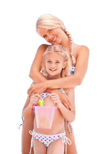 a woman in a bikini holds a little girl in her arms who is holding a pink bucket