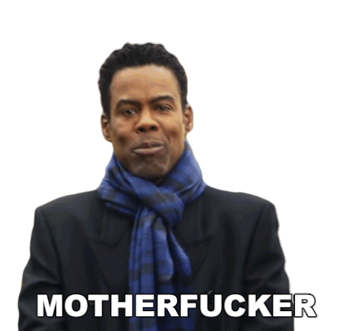Chris Rock, wearing a suit and scarf, delivers a classic expletive with his signature intensity. A powerful and direct moment.