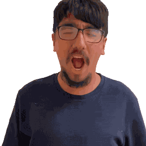a man with glasses and a beard is yawning with his mouth open