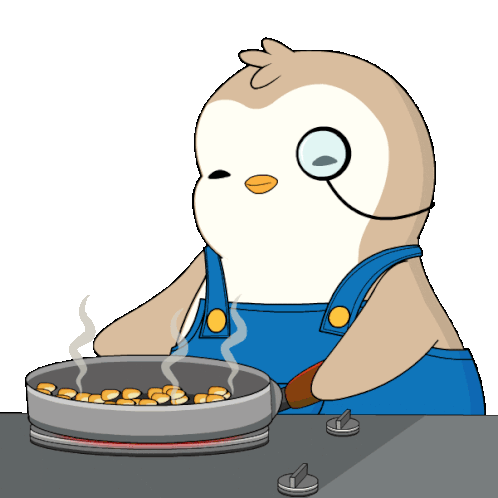 Pudgy Penguin, wearing a monocle and blue overalls, happily makes a pan of fresh popcorn, perfect for a movie night.