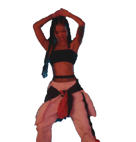Jhené Aiko dancing with her hands behind her head, moving her hips in a black crop top and stylish pants, feeling the music.