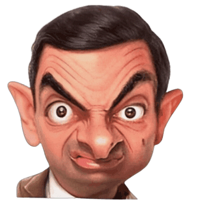 Mr. Bean's caricature with an annoyed expression, featuring exaggerated eyes, furrowed brows, and prominent ears.