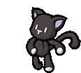Animated pixel art sticker of Mr Mew, the black cat plush from Shiki Misaki, walking and dancing.