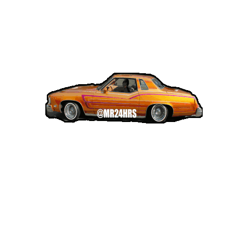 An orange lowrider car with 'MR24HRS' on its side, hopping and bouncing on its hydraulics.