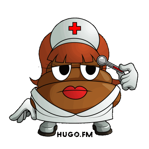 Mrfarts, a cartoon poop character dressed as a nurse, holds a thermometer in its mouth, with "HUGO.FM" branding.