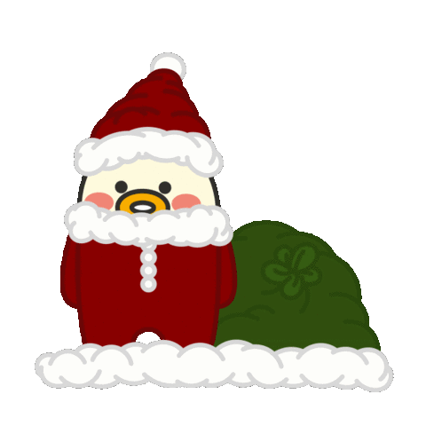 A cute baby chick dressed as Mrs.Claus Santa Claus, waving cheerfully next to a green gift sack, perfect for Christmas.
