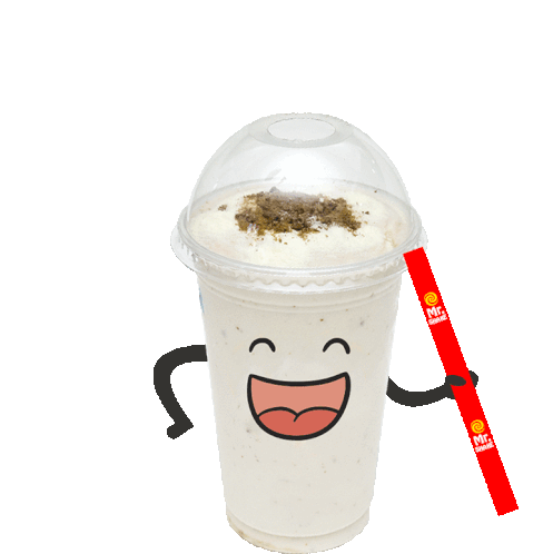 A cheerful Mrshake milkshake cup with a happy face and arms, holding a red straw, perfect for expressing joy.