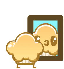 A cute cartoon muffin gazes admiringly at its reflection in a mirror, with hearts floating around, embodying the Malay word 'Perasan' (vain).