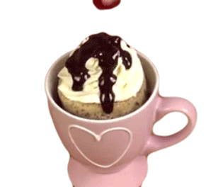 A delicious mug cake in a pink heart mug, topped with white frosting, chocolate drizzle, and a red cherry.