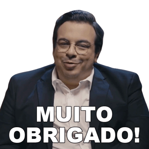 Luis Lobianco, wearing a suit and glasses, winks and smiles while saying 'Muito Obrigado!' to express thanks.