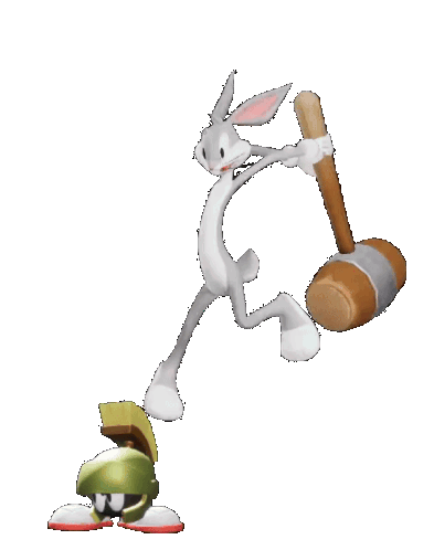 Bugs Bunny from MultiVersus slams Marvin the Martian with a large mallet, depicting a classic cartoon attack.