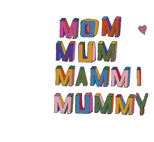 A vibrant animated sticker featuring the words 'MOM', 'MUM', 'MAMMI', and 'MUMMY' in colorful 3D block letters, perfect for Mother's Day.