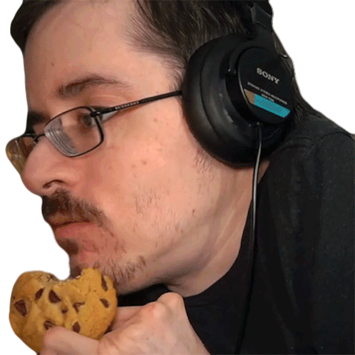 Ricky Berwick, wearing headphones, enjoys a delicious chocolate chip cookie, taking a satisfying bite.