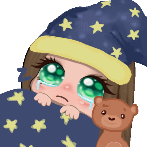 Mura004 Mira004, a cartoon girl with green eyes, cries while snuggled in a starry blanket with her teddy bear, indicating a sad or sleepy goodnight.
