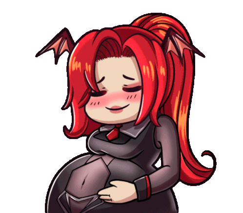 Animated sticker of Murdercrumpet, a red-haired character with wings, gently holding her pregnant belly with a loving expression.