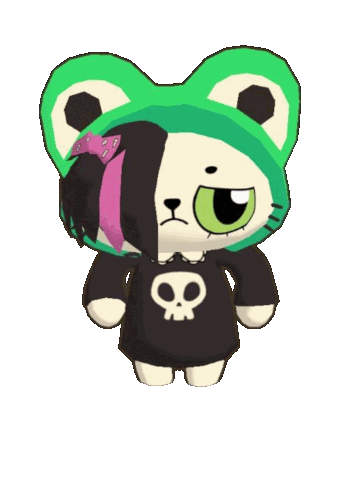 a stuffed animal wearing a green hat and a black skull shirt