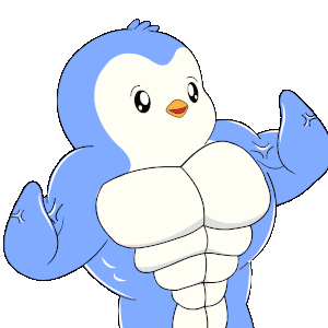 A strong, muscular Pudgy Penguin, Pengu, flexing his biceps with power and confidence.