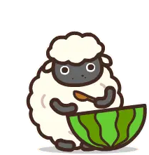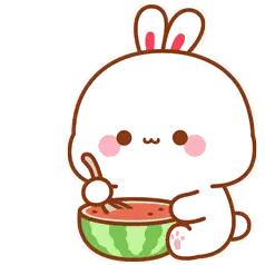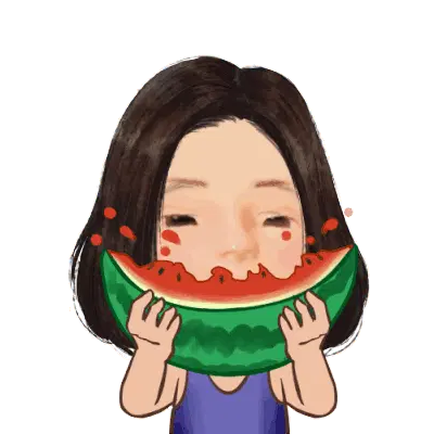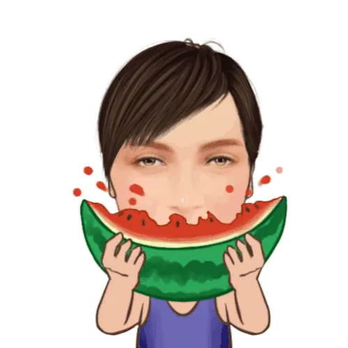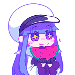 Marija from Muse Dash, a cute cartoon girl with purple hair, happily eats a slice of watermelon, her eyes sparkling.