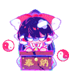 Reimu Hakurei from Touhou Project, depicted in vibrant pixel art, sits with an offering box, reacting with a cute expression.