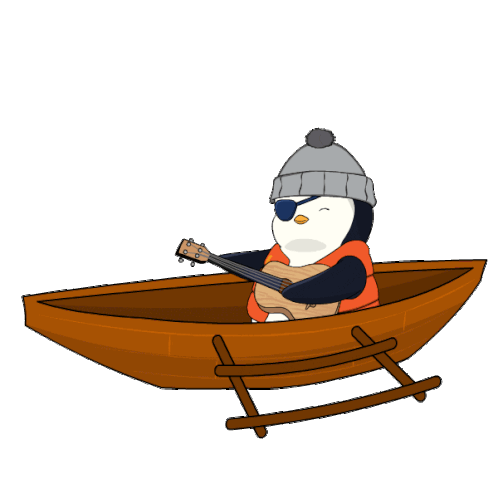 A cute Pudgy Penguin, wearing a beanie and eyepatch, serenely plays a ukulele in a wooden boat, creating a chill, musical vibe.