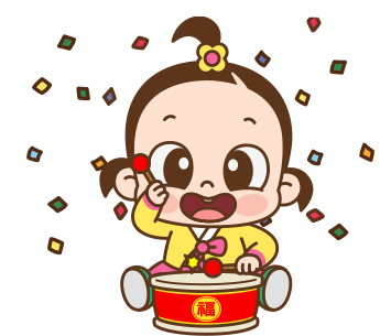 A cute baby girl joyfully plays a drum adorned with the Chinese character '福' (fortune), surrounded by colorful confetti.