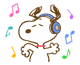Snoopy, the beloved cartoon beagle, happily listens to music with headphones as colorful notes float around him.