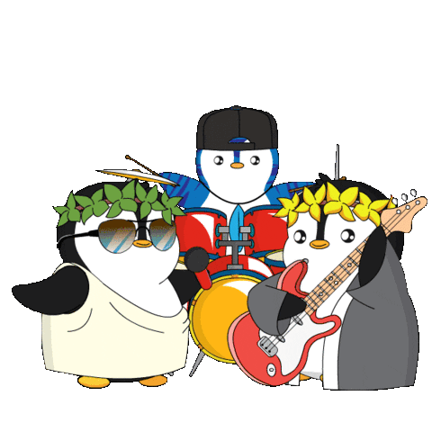 Three adorable Pudgy Penguins form a rock band, playing guitar, drums, and singing, ready to jam at any music party.