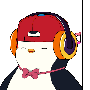 A cute pudgy penguin wearing a red cap and headphones, happily jamming to music with a pink bow tie.