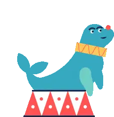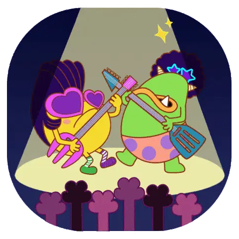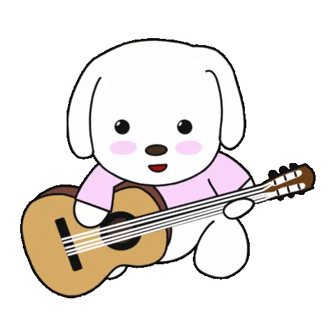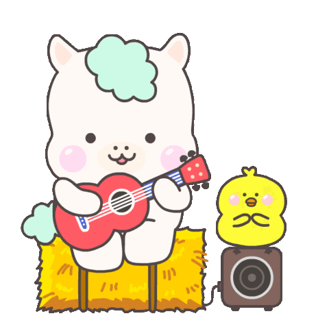 A cute white animal character plays a red ukulele while a yellow chick sits on a speaker, with music notes floating around.