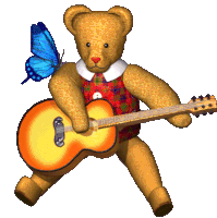 An adorable teddy bear strums a guitar, accompanied by a blue butterfly perched on its shoulder.