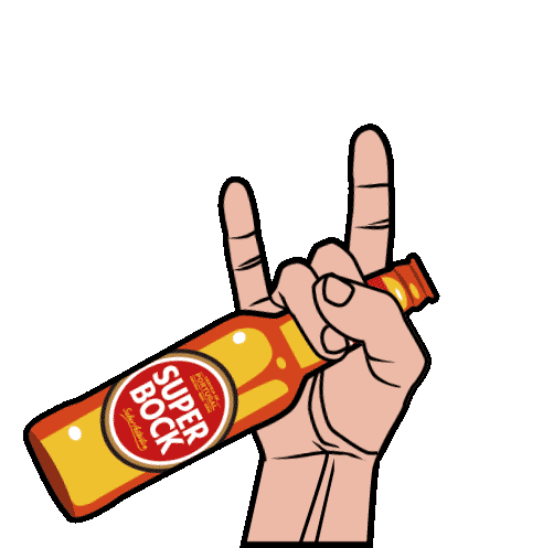 A hand makes a rock and roll gesture while holding a bottle of Super Bock beer, perfect for music lovers.
