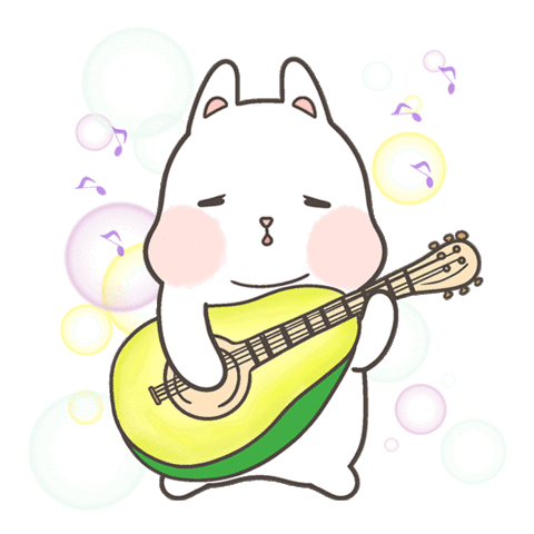 Adorable white rabbit character playing a unique avocado-shaped guitar, surrounded by floating musical notes and bubbles.