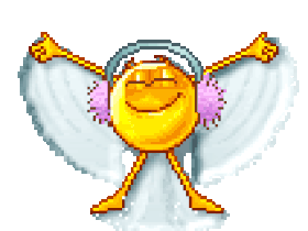 Animated pixel angel emoji with headphones and wings, smiling and moving its arms, conveying a cheerful and musical vibe.