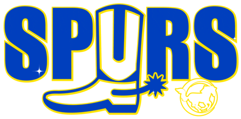 A vibrant blue and yellow logo featuring the word 'SPURS' with a cowboy boot as the 'U' and a mustang emblem.